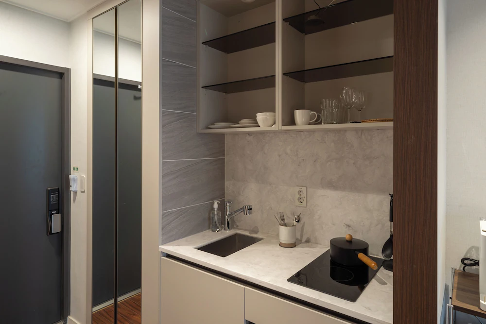 - 화재 경보기가 매우 민감하여 흡연 및 연기가 많이 나는 음식류의 조리는 불가합니다. (육류, 튀김류, 생선류 조리, 대게 금지)