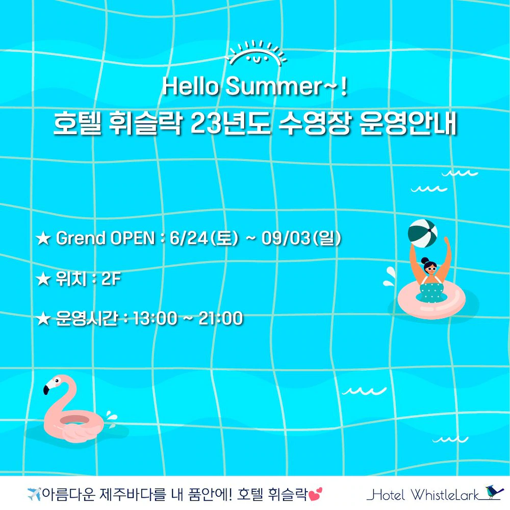 - 계절에 따라 운영되는 수영장은 6월 05일 ~ 10월 12일에 이용 가능합니다.